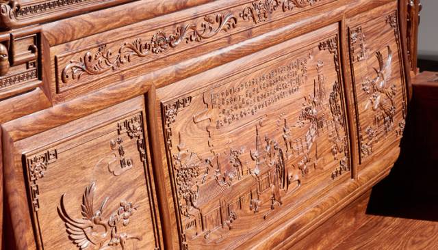 最显著的特征是三人位中间雕刻的著名书画作品——兰亭序。兰亭序作为我国书法艺术上面的一颗璀璨的明珠,将其镌刻在红木家具上面有非常强烈的艺术意义,这在红木纹饰中也算是一个创新。