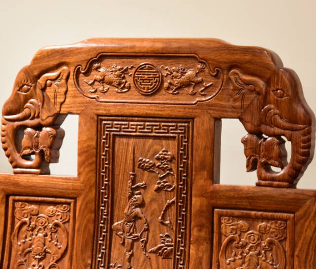 古人云:“太平有象”,寓意“吉祥如意”和“出将入相”。在神话传说中,大象则为摇光之星生成,能兆灵瑞,古佛就是乘象从天而降。还有一说,大象是普贤菩萨的坐骑,相传能预兆灵瑞。象头的形象经常会运用到红木家具的椅背上,沙发椅、餐桌椅的靠背上比较喜欢用到象头的形象。为了讨得好兆头,人们还将象头与其他祥瑞之物进行搭配,象头和如意、福禄寿等组合一起,寓意更加喜庆吉祥。