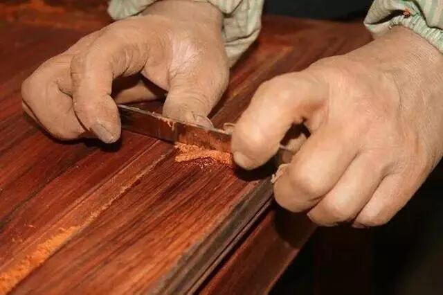 硬木家具上净刨子是很细致的一个活计。刮的时候要顺着木纤维的生长方向刮,力度要一致,速度要均匀。但是因为木材的纤维生长方向比不都是一致的。所以,刮的时候难免在两个方向相交的地方产生崩岔的现象。