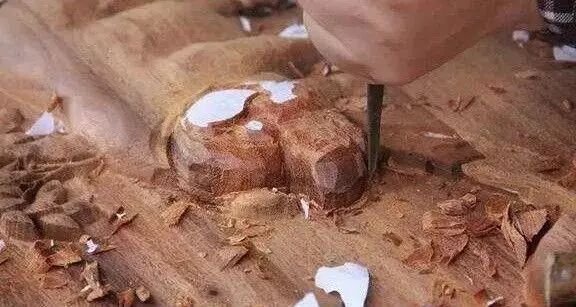 雕刻硬木,稍有不慎就会有小的崩岔。有些木材的纤维并不都是顺着一个方向的,有的地方就是有纤维交错的生长,这些地方雕刻的时候很容易掉渣,所以只能补,没其他办法。