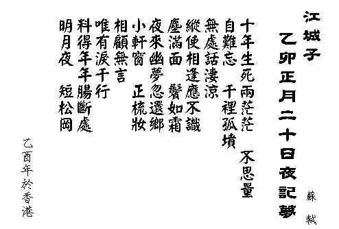“十年生死两茫茫,不思量,自难忘。千里孤坟,无处话凄凉。纵使相逢应不识,尘满面,鬓如霜。夜来幽梦忽还乡,小轩窗,正梳妆,相顾无言,惟有泪千行。料得年年肠断处,明月夜,短松冈。”