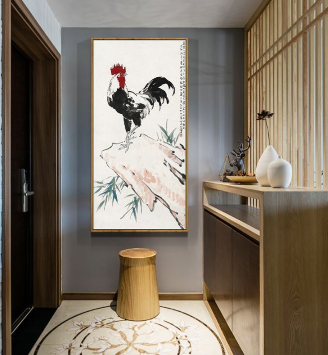雄鸡有伍德即文、武、勇、仁、信,且雄鸡善斗,目能辟邪,所以雄鸡是一种辟邪吉祥物,挂在客厅中还可消除桃花劫。