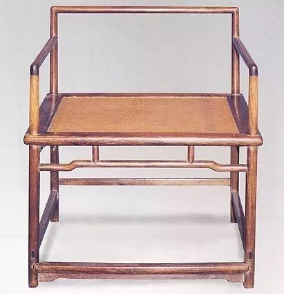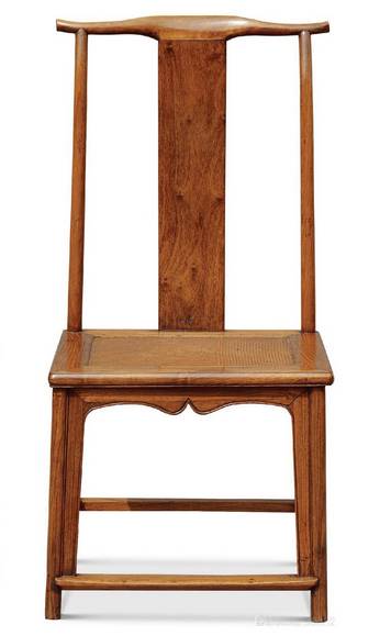 此椅搭脑中部削出斜坡,以便颈项倚靠。两端微微翘起,并略向后兜转,制作圆浑,给人舒适之感。靠背板独木无雕饰,向后弯曲,圆婉合度,至底部始有垂直之意。椅盘做出冰盘沿,线脚稍稍内敛。迎面的券口牙子锼出单尖壶门式轮廓,弧线柔和却有弹性。踏脚枨下托以极窄的牙条,两侧及背面均为单枨。此椅在同类椅具中可谓造型至为简练的一种。