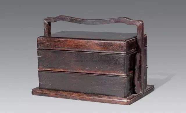 提盒单具者多,成对者少,紫檀成对者就更为难得。该提盒三撞,连同盒盖共四层,置于长方形底框的槽口内。由于盖撞之间及各撞之间均有子口咬合,故盒盖固定后,各撞皆无错开或脱落的现象。