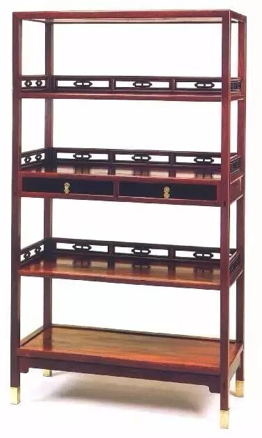 架格为四层全敞式。其上三层设栏杆,栏杆以黄花梨作外框,正面用立材界成三格,每格内套乌木仔框,安卡子花一朵。侧面不加立材,也套乌木仔框,安卡子花二朵。卡子花扁而长,两端突出,造型罕见。第二层格板下安扁而宽的抽屉两具,乌木作前脸,配以壶形白铜的吊牌。架格栏杆之矮,抽屉之扁,想是为求空灵疏朗之效,而乌木与黄花梨相配,黝黑浓黄,相映成趣。