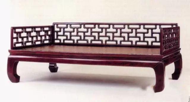 床身有束腰,素直牙条,四足鼓腿彭牙,内翻马蹄。腿足大挖,弧度不大,此是受紫檀料本身所限。围子用料细致,玲珑疏透,但无损其典雅俊美。围子用攒接法做成曲尺式,这一图案早在北魏时的洞窟艺术中已经出现。