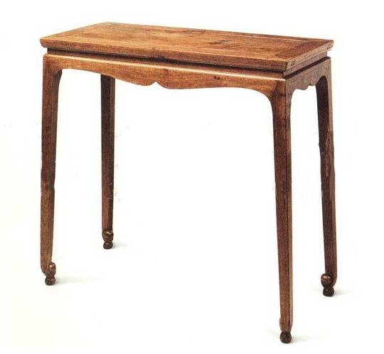 小条桌长度不及一米,牙条正中锼出壶门拱尖,与束腰为一木连做,四面不设枨。此桌足端马蹄向内卷转,以圆球为结束,足下并承以底部切平的圆球。圆球的支垫再加上足腿的修筑,予人翼然飘举之感。