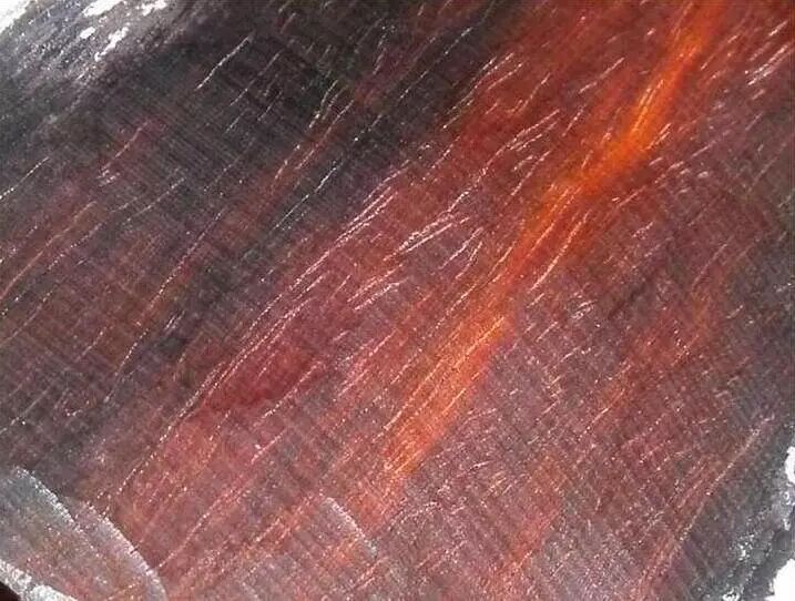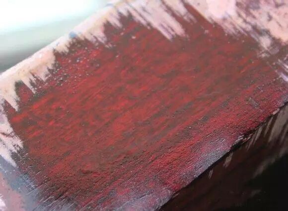 白漆料表面一般都刷有一层彩色的建筑油漆,带有沧桑感,这种紫檀料不但给大家带来了神秘和新鲜感,而且都 带有牛毛纹、金星等明显的紫檀特征,并经过打磨后常常会呈现火焰纹,因此备受追捧。