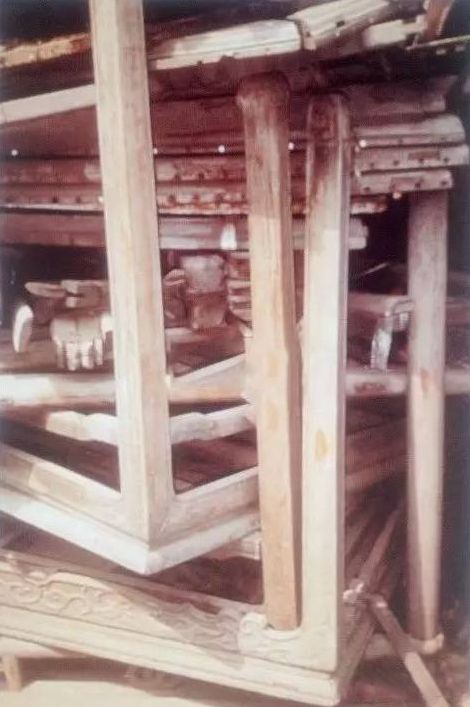 照片上还能清楚的看到,因风吹日晒泛白的家具,已经在腿上刮出内在的木质颜色,金灿灿的闪耀着,明显是黄花梨一类。