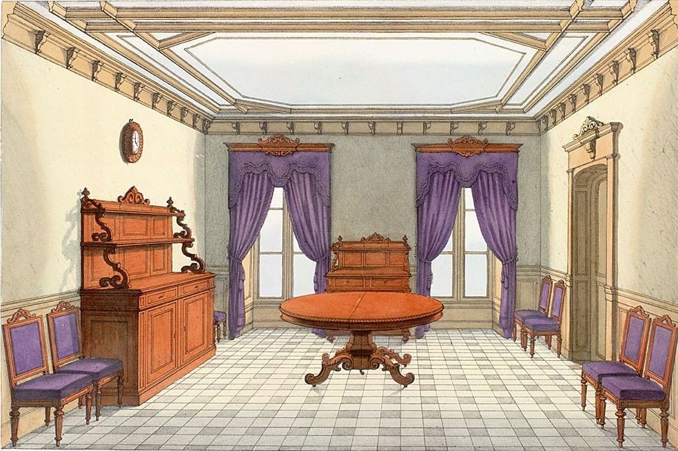 椅子常常是紧密地沿墙成排放置, 地面中央通常不放家具,甚至也不铺设地毯,代之以大面积擦得亮堂的地板,座椅常常围绕壁炉设置,摆放随意。