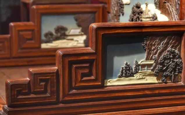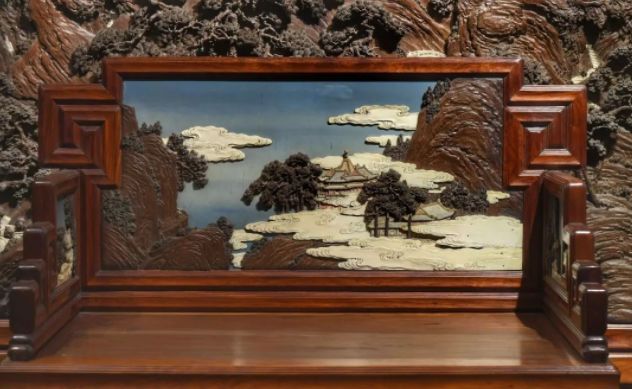 清乾隆 黄花梨嵌牙木雕山水屏风及宝座(局部)