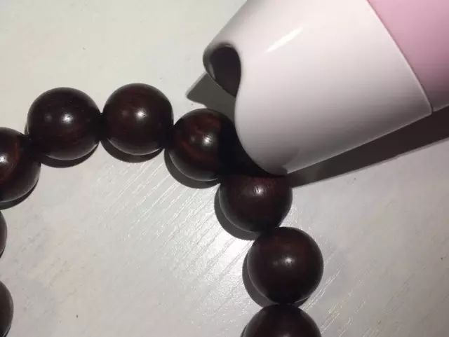 对于做好的珠子,可以把一根铁丝烧红,穿到珠子中间的孔道里,一样会冒出一屡白烟,如是小叶紫檀,从这屡烟中就可以闻出明显的檀香味来。