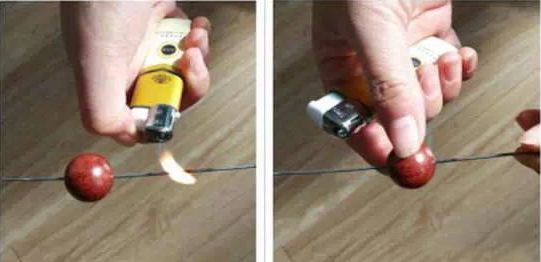 当然,为避免把烧红的铁丝穿到孔道时手忙脚乱的烫伤自己,可以先把珠子穿到铁丝上,把铁丝一端烧红后将珠子移到烧红处即可。
