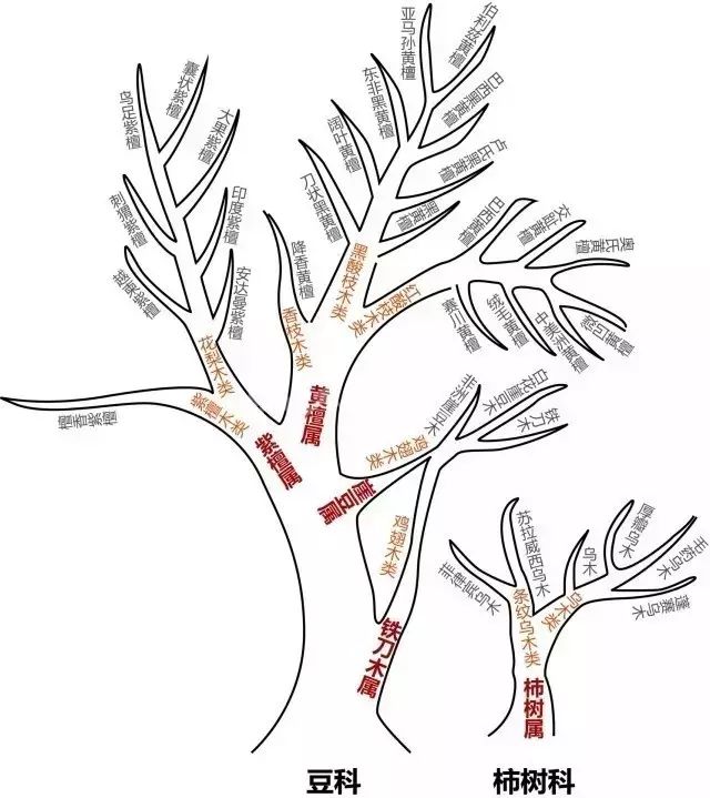 市面上红木材质称谓繁多,让人云里雾里,国家根据密度等指标早已对红木进行了规范,把红木规范为:二科、五属、八类、二下九种。所以,除了下图中的木材品种,其它的都不能称为红木。