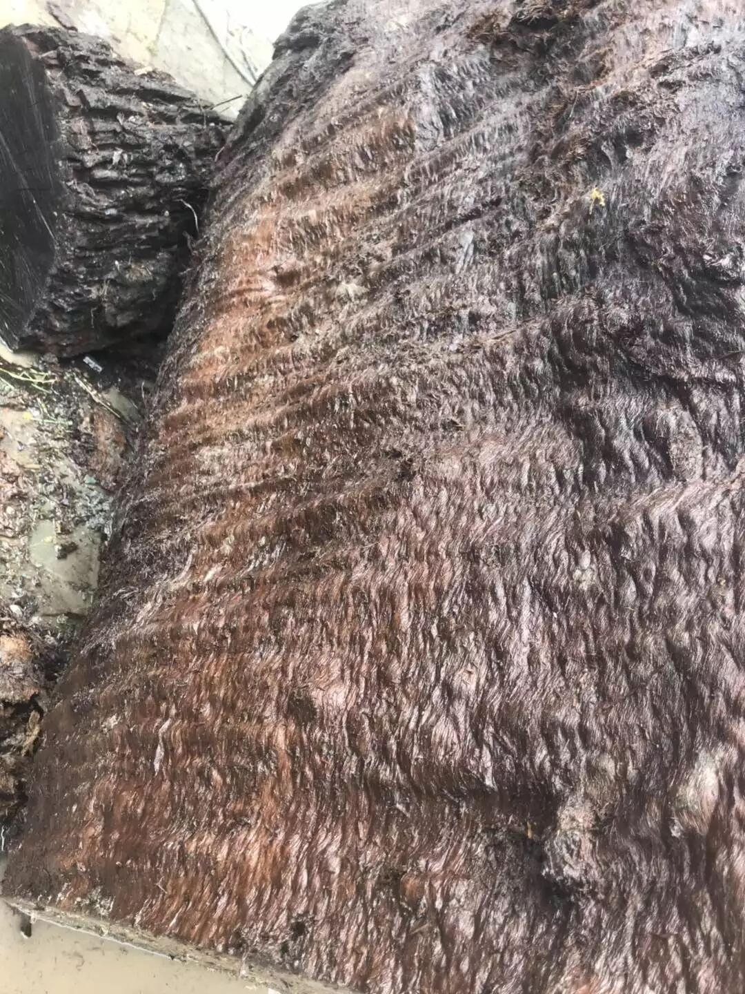 上面两张图片是洗出来的图片,看到这样的图片,很多参与拍卖的人都后悔了,有人说:“再加300万也可以买。运气太好了,这种花纹太稀少了,没有想到洗出来会这么好,树干龙胆纹,树头水波纹,按照现在的市场行情,做成家具至少价值3000万左右”。