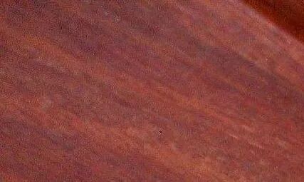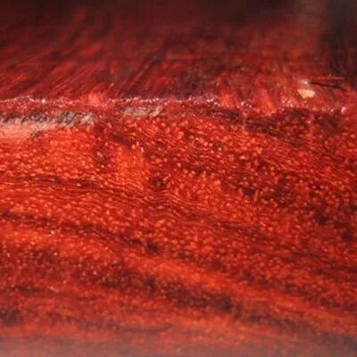 此木材新切面为砖红或猩红色,如长时间暴露在空气中,则由外向内逐渐变成深紫红色至黑紫红色;将木屑浸泡于水溶液中可见红色液体渗出,木纹较直密,硬度也较大,与小叶紫檀的部分特征较为相近。这种木材在两三年前进入中国红木家具市场,虽然此木材与小叶紫檀有部分相似之处,但是通过一些简单的鉴别方法就能判断真假:观察其木屑浸水后有无荧光反应就是最直接的一种,真正的小叶紫檀是会有明显的荧光反应的;而且,从油润度方面来说,小叶紫檀的油性明显要大很多。目前,其市场价格在1.8-3万/吨。