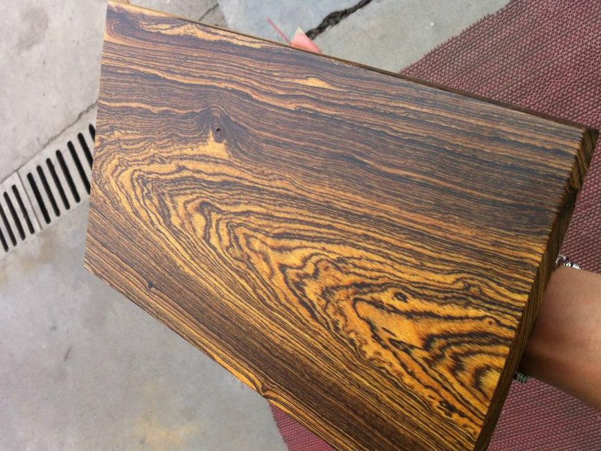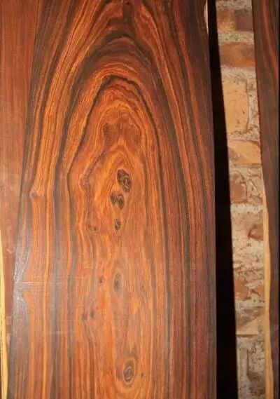 2、心材暗褐色至咖啡色略带紫,久则呈黑褐色,纹理交错不规则,有深浅相间带状条纹,整齐雅观具光泽。