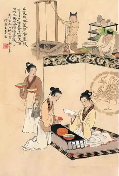 从古画中可见,古人席地而坐,漆案高度适。