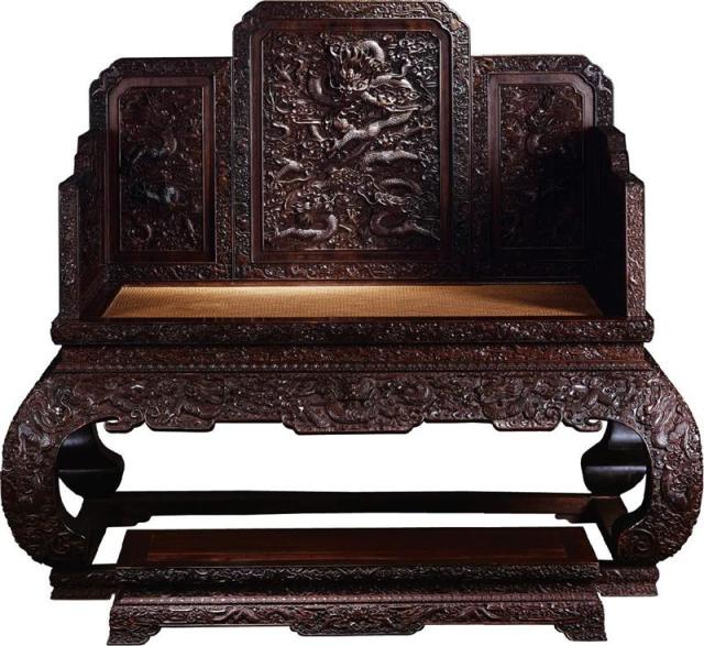 2010年12月北京保利推出一件清乾隆御制紫檀雕云龙纹宝座,通体紫檀木制,腿足膨出,从而在同样大小的面沿下构造出更大的空间框架,使得底座部分的视觉感受更为稳定且富有张力,从而使宝座上部围屏式靠板的龙纹主题位于金字塔式格局的中心,更为引人瞩目。