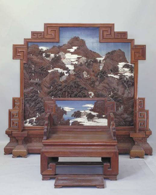 清宫旧藏黄花梨嵌牙木雕山水宝座,长方形,屏风式座围,光素黄花梨边,饰打洼线条,下附托泥。座前设脚踏一只,黄花梨木制。宝座整体用材厚重,造型和色调均达上乘,制作手法极为精制,是清代乾隆时期的家具精品。