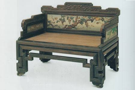 清中期紫檀嵌染牙菊花图宝座,打洼束腰,直牙条内翻马蹄。在牙条与腿的里侧另镶一道回纹垛边,錾花镀金铜套足。其余背框肩角、座面四角均镶铜质錾花镀金包角。此宝座图案色彩艳丽,形象逼真,整体造型大气凛然,神韵非凡。
