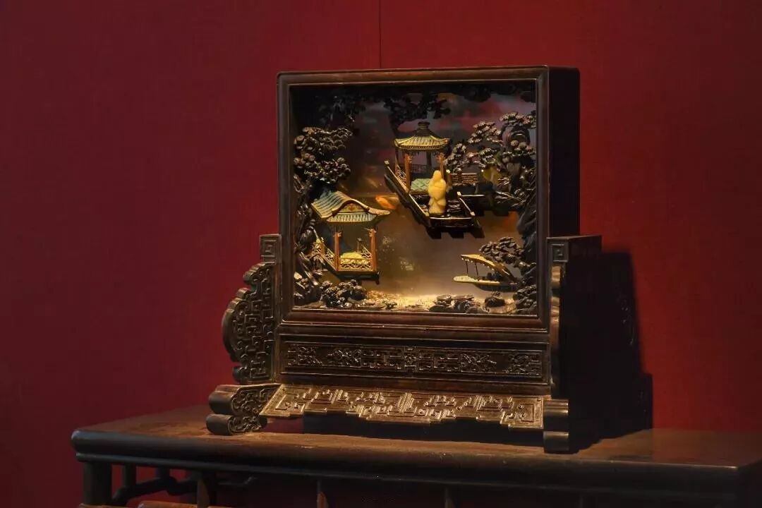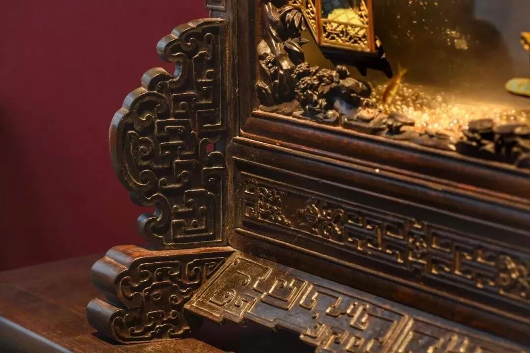 还有一件紫檀嵌珐琅玉石楼阁人物图插屏。屏心为玻璃,用鸂鶒木雕树木、山石,并嵌珐琅雕廊榭、亭台及持有寿桃的玉石老者。内设锡夹层鱼缸。为了达到最佳的展陈效果,里面不仅真加了水,还放了珍珠与活鱼,这使得原本静止的画面顿时鲜活了起来,颇为引人注目。