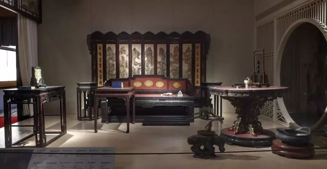 目前故宫博物院家具馆的陈设,主要以文献、插画记载的情景,复原与协调的家具场景,可以让我们看到清代内廷的真实面貌。最为典型的是根据宫廷画家丁观鹏所绘《是一是二图》,原貌呈现的乾隆书斋场景,充分了反映了乾隆对儒释道文化的热衷。