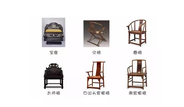 宝座、交椅、圈椅、太师椅、官帽椅、玫瑰椅、挂灯椅、靠背椅、杌凳、方凳、圆凳、春凳、滚凳、条凳、脚凳、修墩