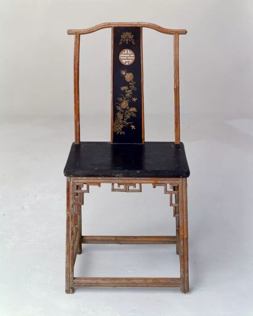 此椅的搭脑、立柱、腿牙及底枨均以湘妃竹制成,惟靠背板心及椅面为黑漆木。此椅朴素清雅,结构简洁工整,竹制构件与黑漆椅面、背板相互衬托,为典型的清中期家具风格。