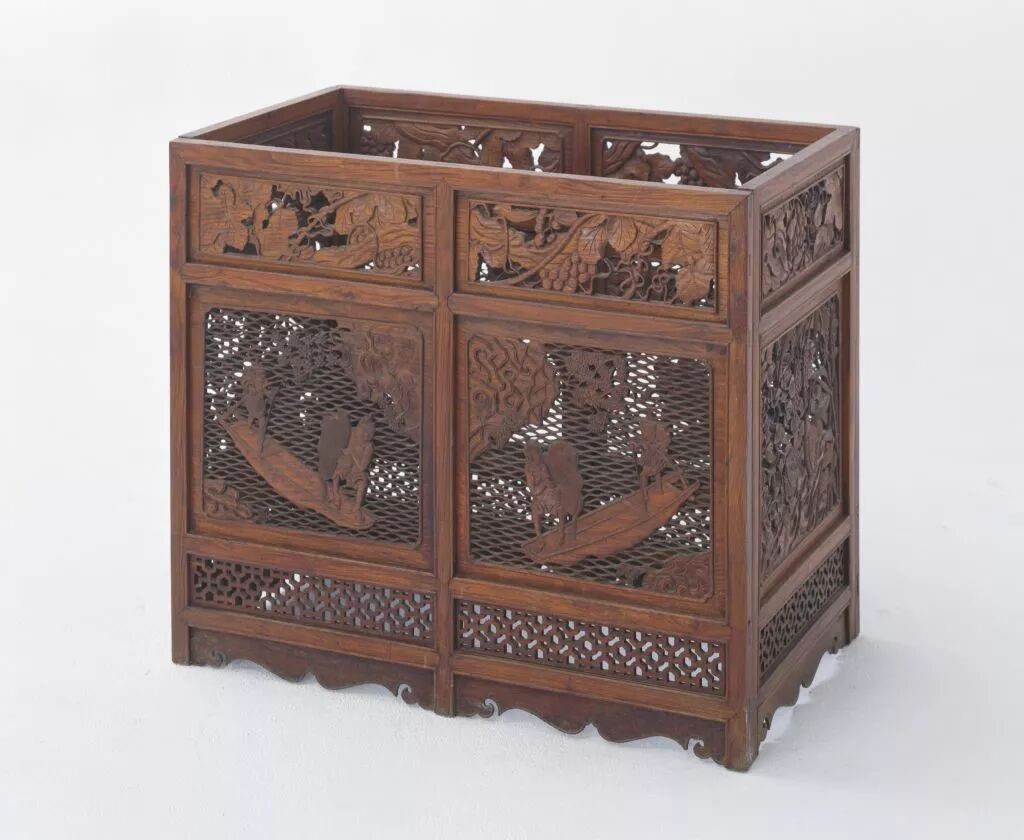此格专为存放古董之用,相当于清中期以后的博古架。其造型优美,纹饰细腻,色调和谐,给人以舒展大方的美感,虽为清初之物,但设计与装饰上的繁缛已具清式家具的特点。