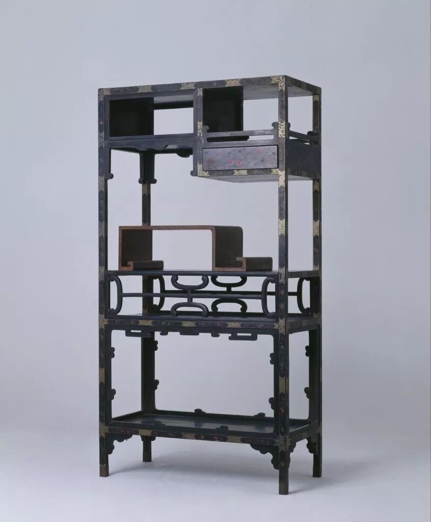 此架格设计奇特精巧,装饰繁缛丰富,充分体现了清代家具“工精料细、苛求华美”的风格特点。