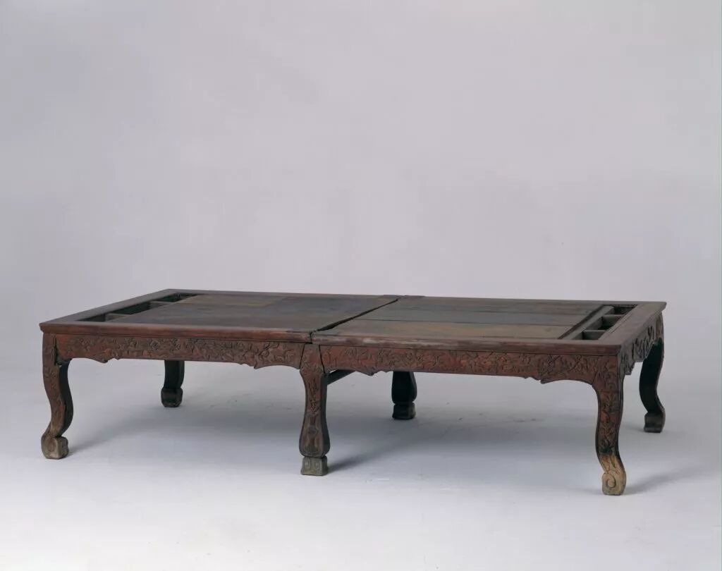 床身以黄花黎木制,床面无围,大边分两节,以合页连接,可以折叠。四腿及牙条浮雕折枝花鸟、双鹿、杂草等,具有浓厚明式风格。