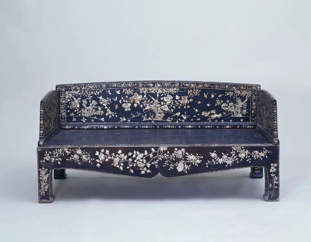 此床制作于山西,结构稳重,通体采用大漆螺钿工艺,显示出雍容华贵、富丽堂皇的气派。