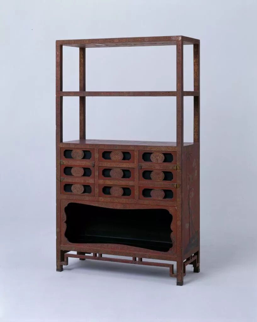 药柜通体髹黑漆,形制为一封书式。采用格子门的式样,为当时惯用的做法。门正面及柜两侧面饰描金开光,内描金升降双龙戏珠纹。柜内中心有八方旋转式抽屉80个,两旁各有长屉10个,每屉分为3格。共可盛药140种。