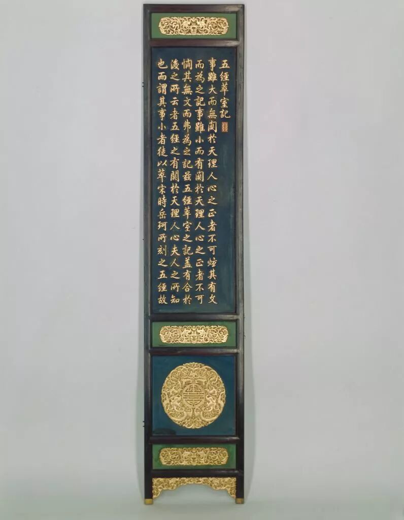 此围屏装饰庄重典雅,图文丰满,别具一格,原为乾清宫东侧昭仁殿内后西室所陈之物,嘉庆年间乾清宫失火,殃及昭仁殿,殿内的岳刻五经连同《五经萃室记》围屏全部被焚毁。如今的五经及《五经萃室记》围屏均为嘉庆时火灾后按原样复制的。