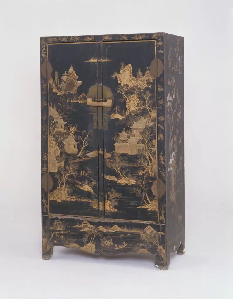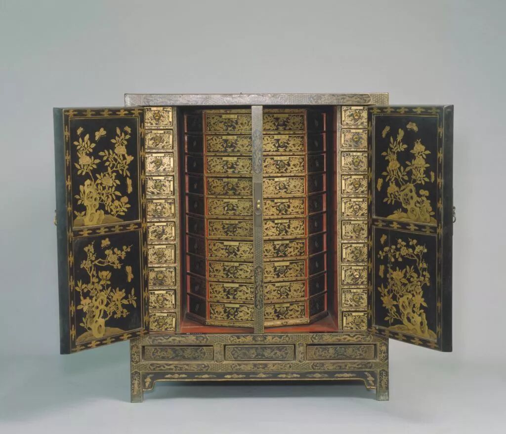 顶箱立柜这样体量巨大的家具却有如此精心描绘的漆饰是很少见的。从档案可知,此物原置于四执库,那里曾是保存皇帝所用冠履之处,这大概是其不惜工本制作的原因吧。