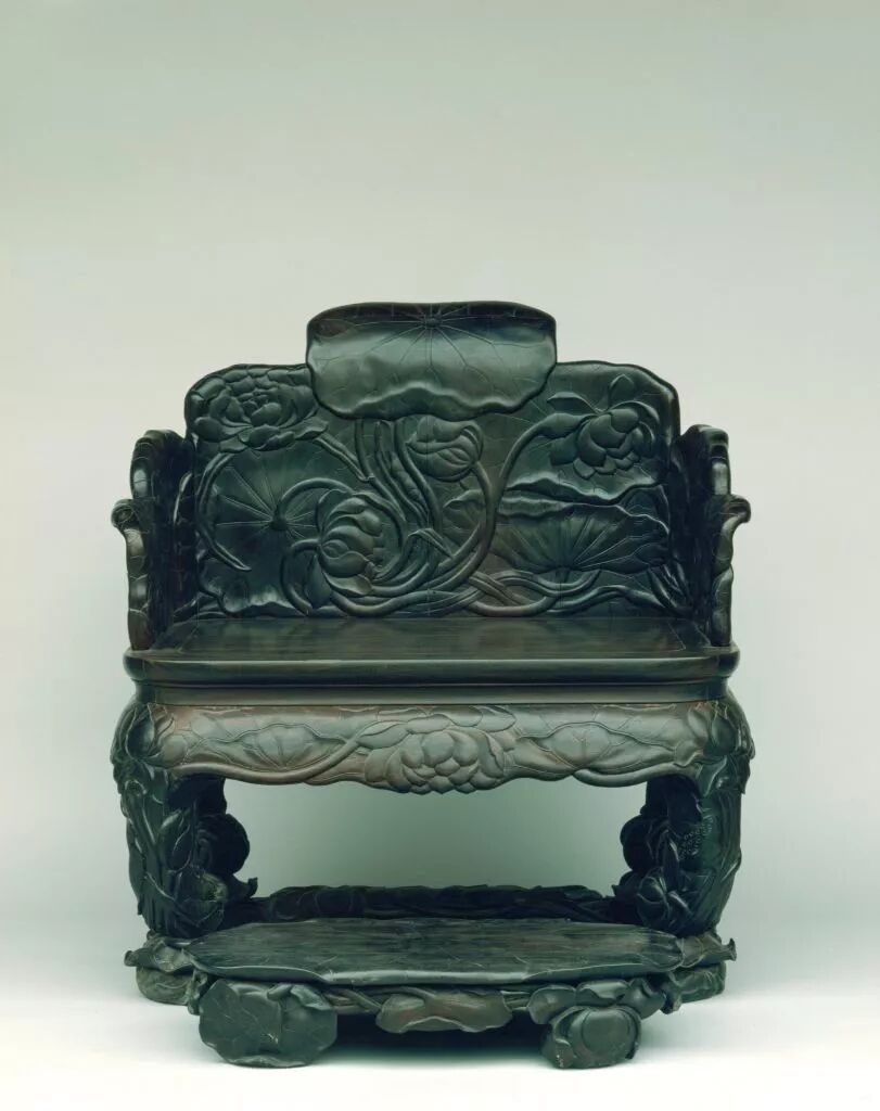 此宝座属单独陈设类的家具,在宫中往往和屏风、宫扇共用,设在屋宇明间的正中,位置固定而不轻易挪动。宝座取材厚重,木质精美,造型圆浑,舒适耐用。宝座上的荷花、叶、梗、藕皆以自然形态布满整体,颇类元明时期雕漆花卉器物上的雕刻手法,在传世的明代家具中仅此一件。