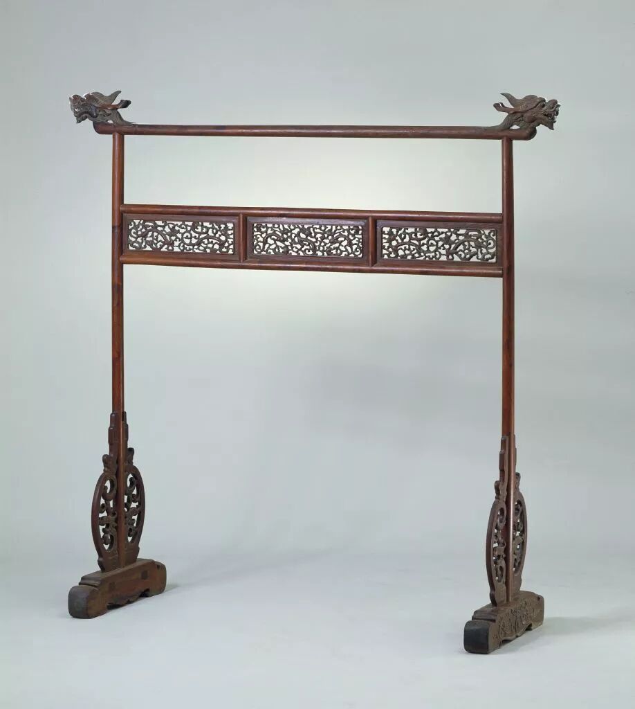 衣架为卧室家具,脱下的衣物可搭在搭脑和中牌子的横杆上。因古代皆穿长袍,所以衣架也做得较高而使衣物不至垂地。此件衣架造型简洁明快,合乎实用,装饰纹样具有鲜明的皇家风格。