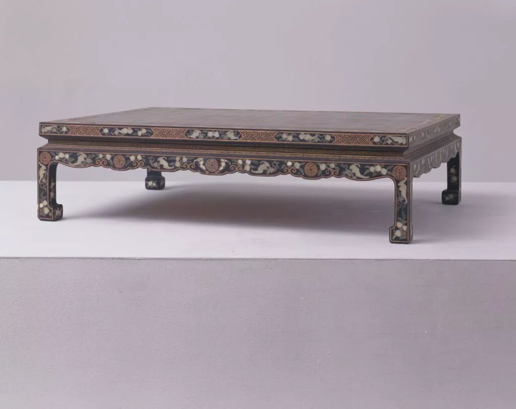 此炕桌作工精湛,黑漆地采用描金、嵌玉等多种技法装饰,金玉交辉。此桌应为乾隆帝万寿庆典时祝寿所用。