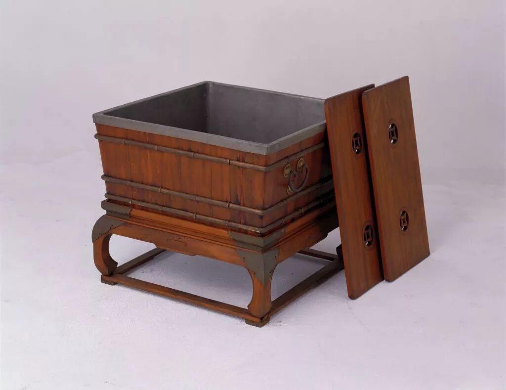 冰箱柏木质。箱上有一对箱盖,盖上有4个铜钱纹开光,用于将箱盖提起。箱内设一层格屉。盛夏时节,天气炎热,在格屉下放置冰块,将食品置于屉板之上,而箱内四壁用铅皮包镶,可以隔绝外面的热气进入箱内,利于冰块保持低温,对箱内储藏的食品起到冷冻保鲜的作用。冰箱外部的两个侧面各安两个铜提环,以便提拉冰箱之用。