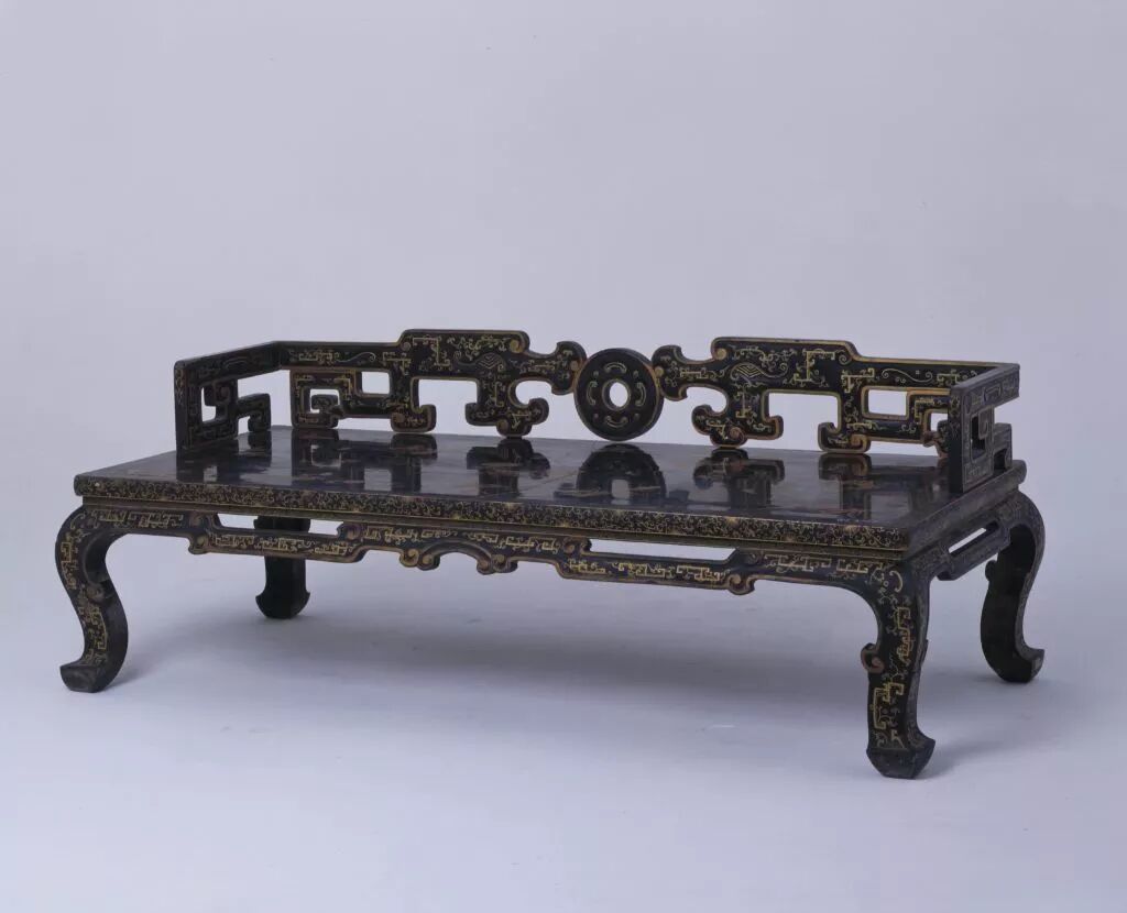 该床通体黑漆地,三面矮床围做成双夔龙拱璧形状,两面绘拐子纹及卷草纹。床面及侧沿亦有描金折枝花卉及卷草纹。面下有束腰,饰描金水波纹。拐子纹牙条,三弯式腿,其上描金拐子纹及卷草纹。