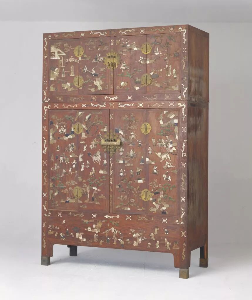 此类柜又称顶箱立柜,由底柜与顶柜两部分组成。一般成对摆设,所以又称四件柜。此柜即为成对柜之一。柜面所嵌饰件高于面板,具有立体感。于黄花梨材上作镶嵌装饰,在家具工艺中较为少见。
