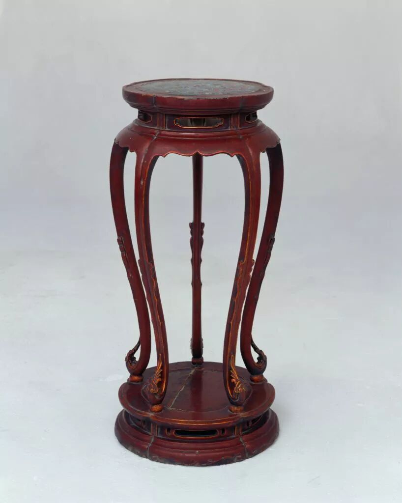 此香几通体髹红漆,几面为五瓣梅花式,中心打槽,嵌珐琅面心。足下踩圆珠,落在台座上,台座面下亦有束腰,开长方形透光,其样式与香几上部呼应,体现了明式家具的风格特点。