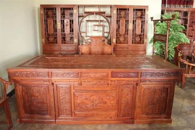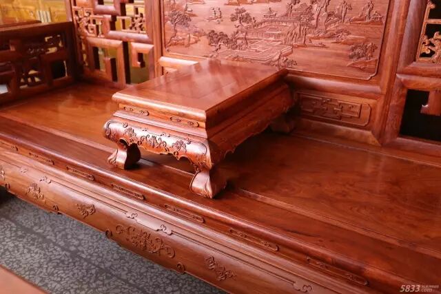 一件选材考究,雕饰精美的红木作品,它不仅似一件家具,更是一件工艺品。以形态图案而言,红木家具外形稳重沉实,图案在选题与雕刻上又相当自然活泼,精巧生动。就外观设计而言,精细的雕饰图案调和了家具在造型上的厚重感觉,平添了几分柔美。从精神的内涵来看,家具的纹饰各具特色,刻画生动细腻,技法炉火纯青,在平稳的造型中表达了精彩活泼的变化。