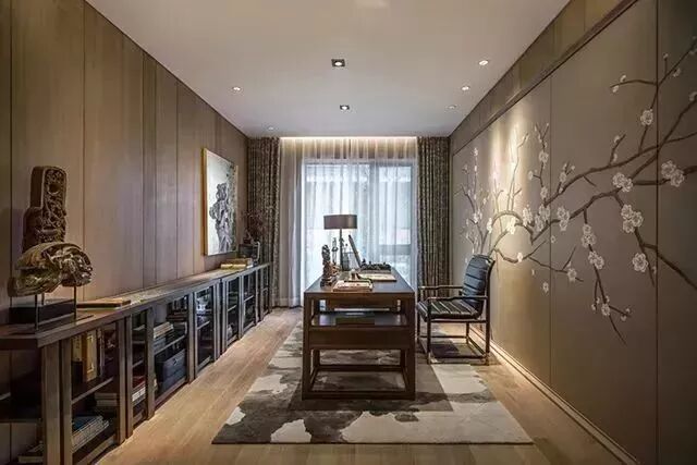 搭配精致的雕花书桌和靠窗的罗汉床,营造出一种中式传统文化的积淀。而搭配线条简练、具现代气质的床塌,则宛如给了人视觉上的留白,让卧室个性鲜明。