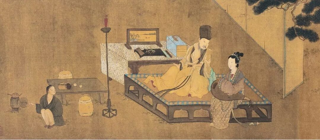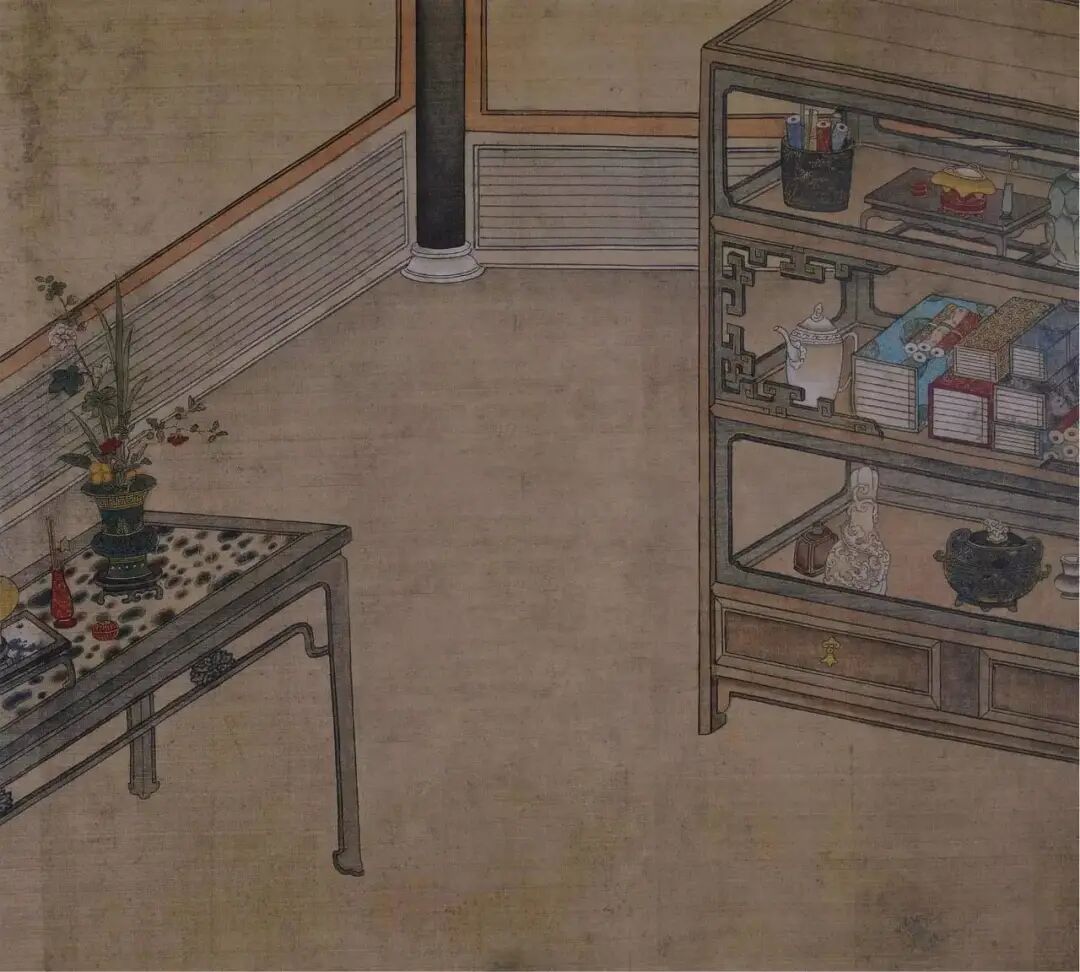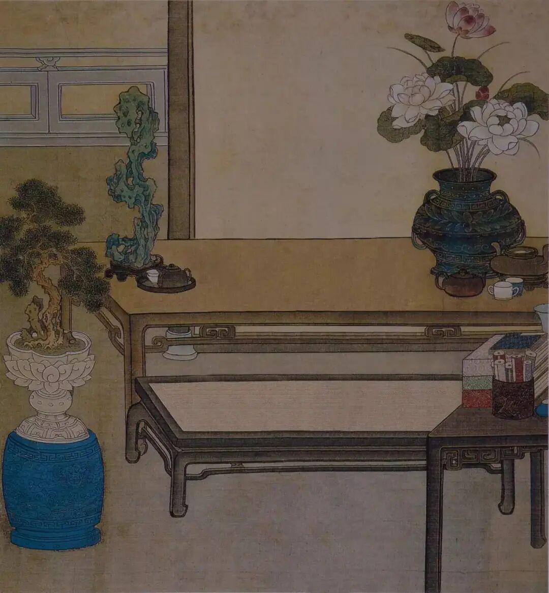 这与高濂所著的《遵生八笺》中介绍书斋布置极为相似:“斋中长桌一……左置榻床一,榻下滚脚凳一,床头小几一……壁间挂古琴一,中置几一……吴兴笋凳六,禅椅一……右列书架一。”
