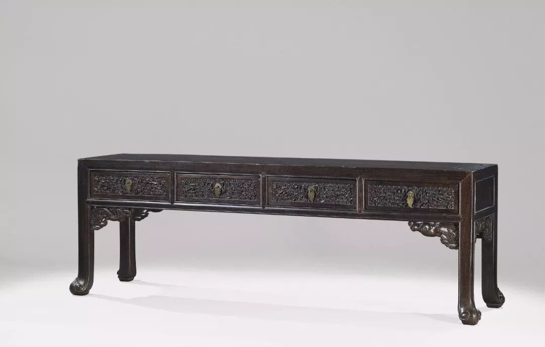 清乾隆 紫檀雕云蝠展腿如意纹四抽炕桌