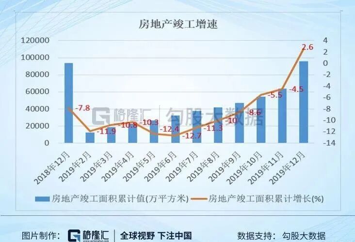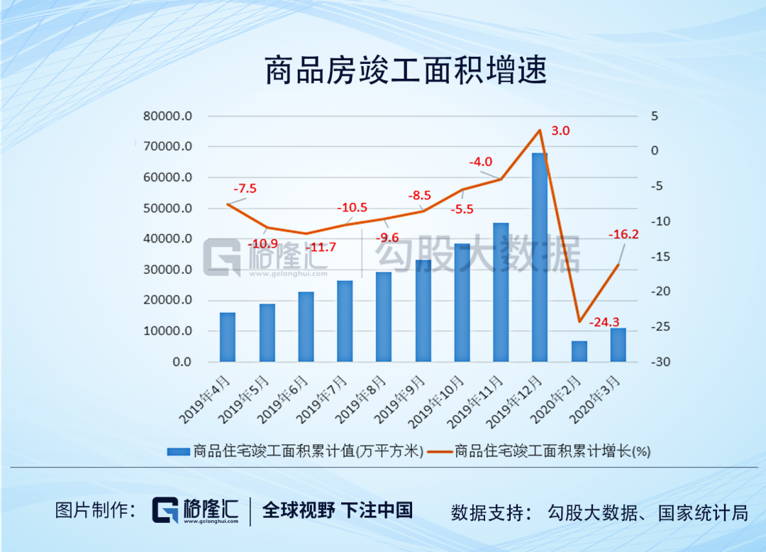 再看2020的数据:因为疫情影响工地不能开工,2020年2月份商品房竣工面积增速同比下滑了24.3%,但从3月份开始增速快速回升,竣工面积累计增长从-24.3%迅速回到了-16.2%。