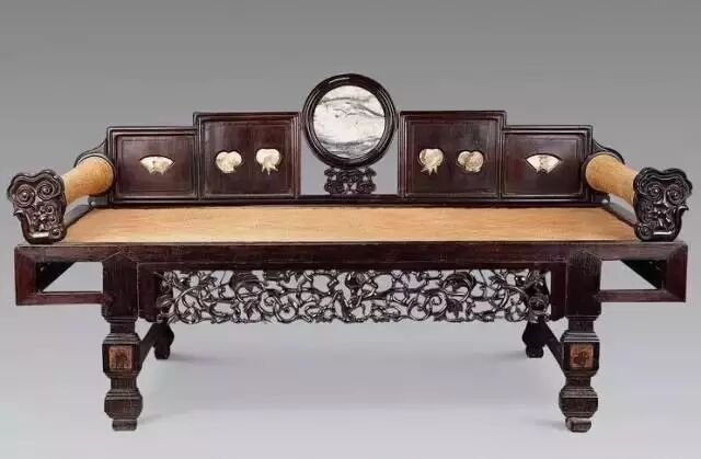 在制作上,美人榻也十分讲究,后背有围栏突出并呈阶梯状,其意为“步步高”,中间常镶以秀丽的云石,并雕刻精美的吉祥如意图纹。