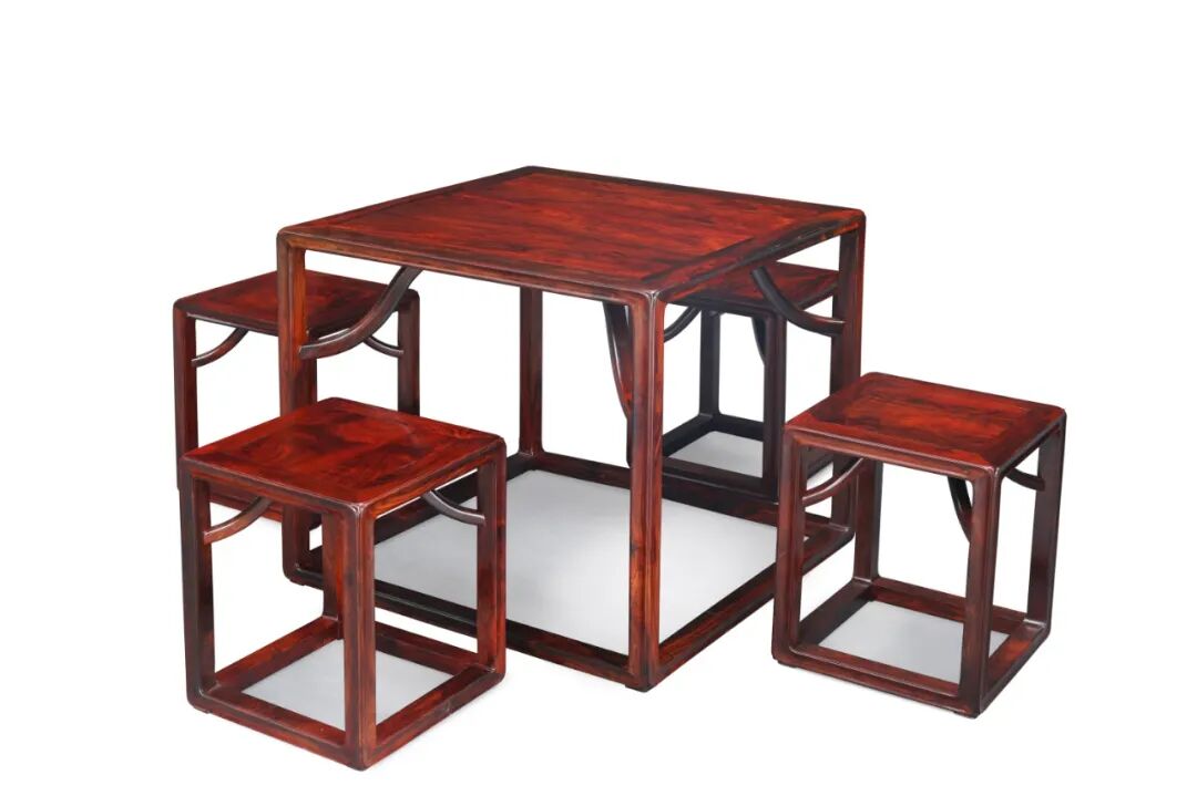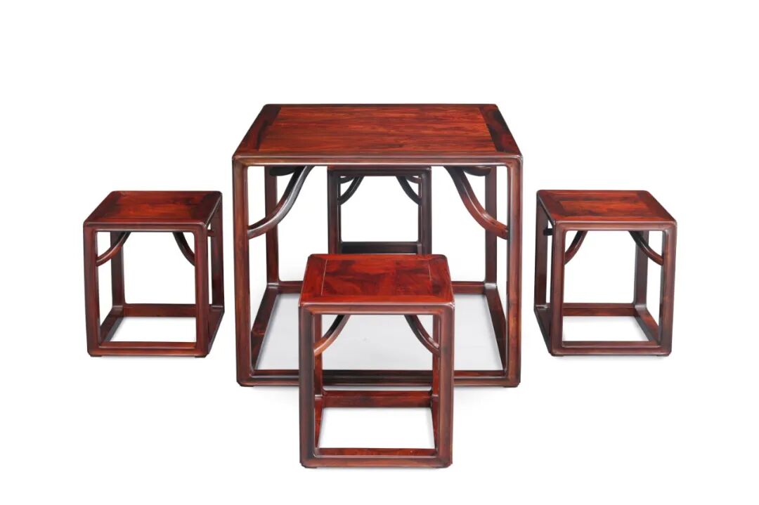 造就其外形美观简约而不失牢固,特别是此套方桌在添加了霸王枨构件后并未像一般桌案类直接以腿足落地,而是将四足底与横枨相连,使得整体既有实用之效,又具装饰之美,当属文人雅士的最爱。方桌配套四把相似形制的方凳,使得整体和谐。